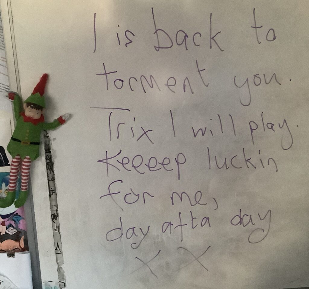 The crazy elf has arrived in 6B but he is no ordinary elf, he is a SPaG expert! He has started his visit by challenging 6B all about adverbials. They had to produce anchor charts and prove they could include of range of adverbials accurately in sentences before he would release the chocolates. 6B smashed it and are well on their way to becoming SPaG experts too! I wonder what he will get up to tomorrow?