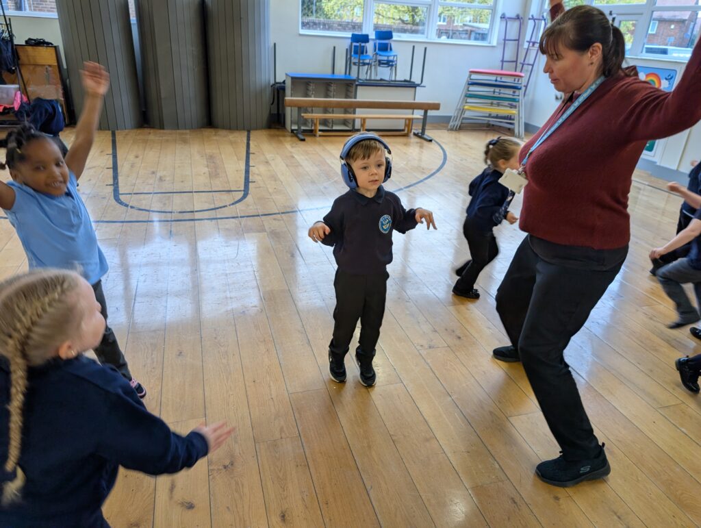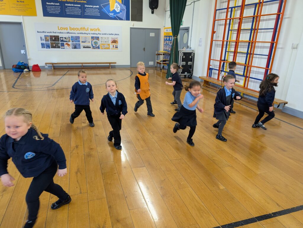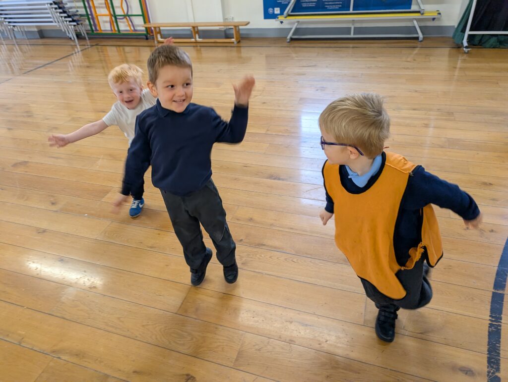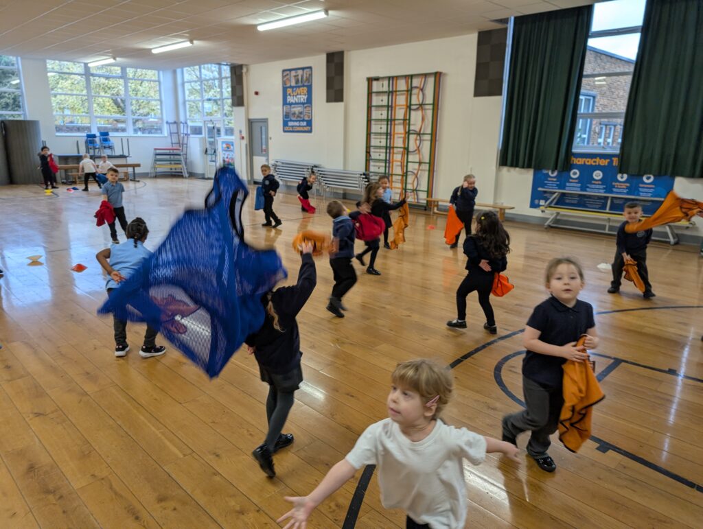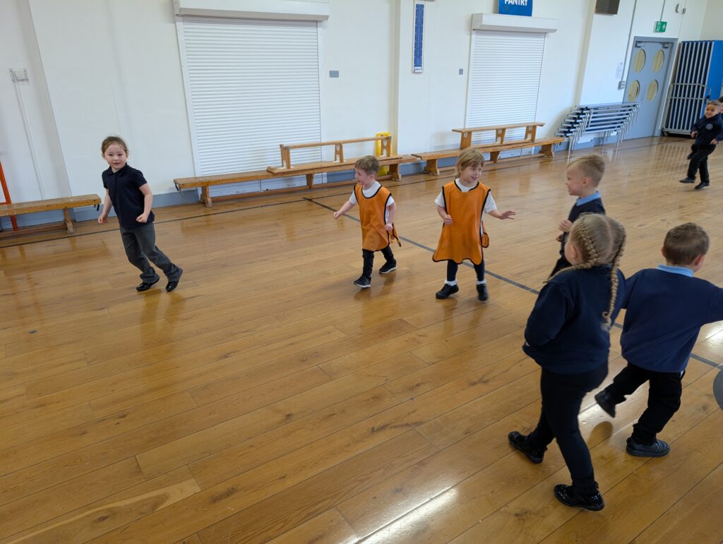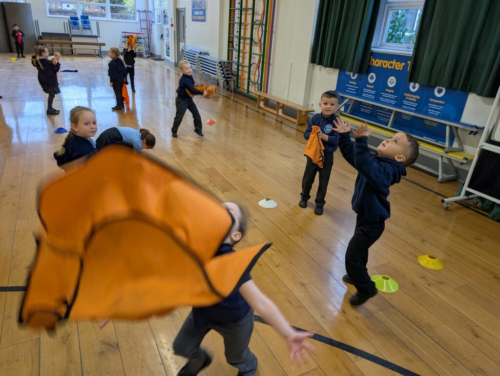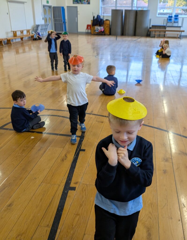 Playing bonfire and firework games in PE. We moved like fireworks, we played firework tag. We learnt to balance cones on different body parts. We learnt to throw and catch a bib in different ways.