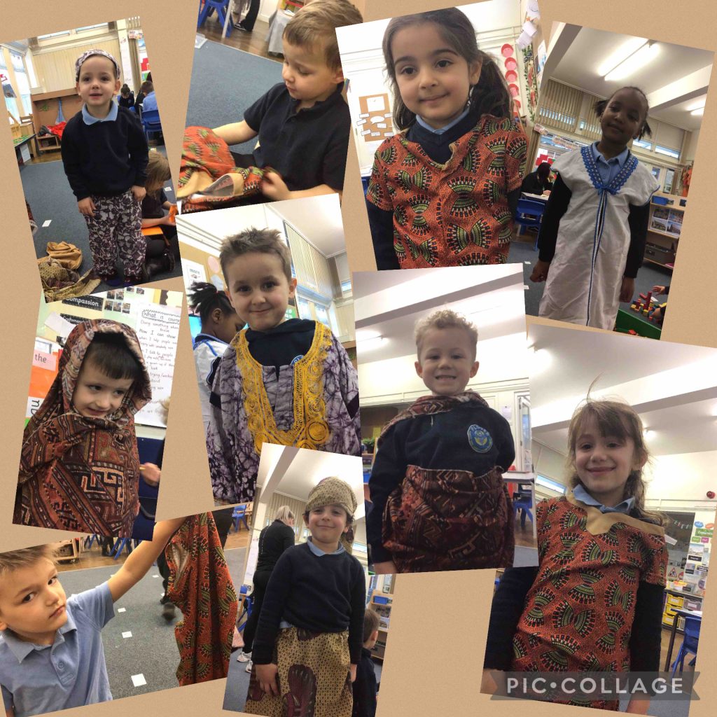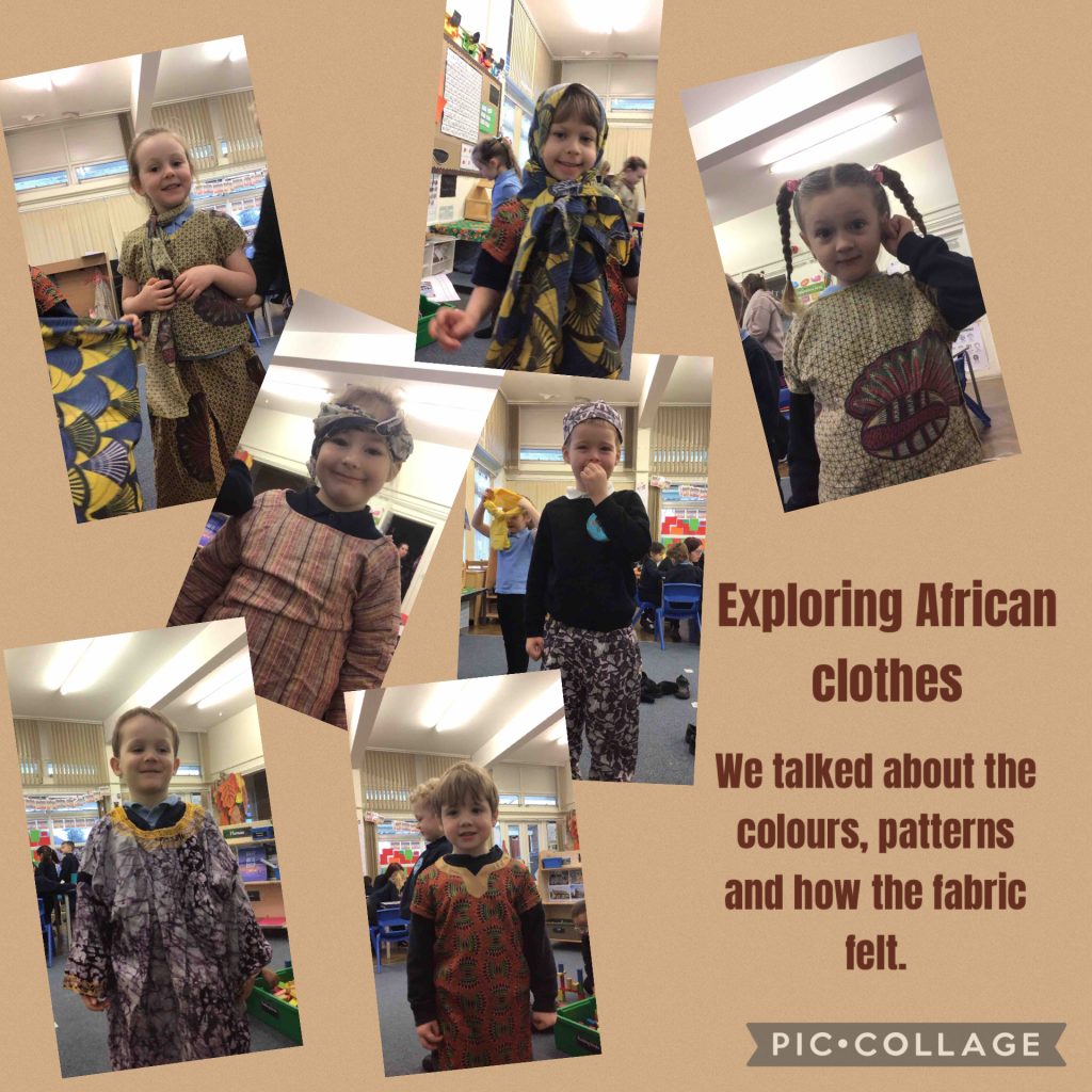 We looked at different clothes from Africa. We noticed that lots of them were bright colours and had lots of patterns on. We also noticed that lots of African people wear the same clothes as us.