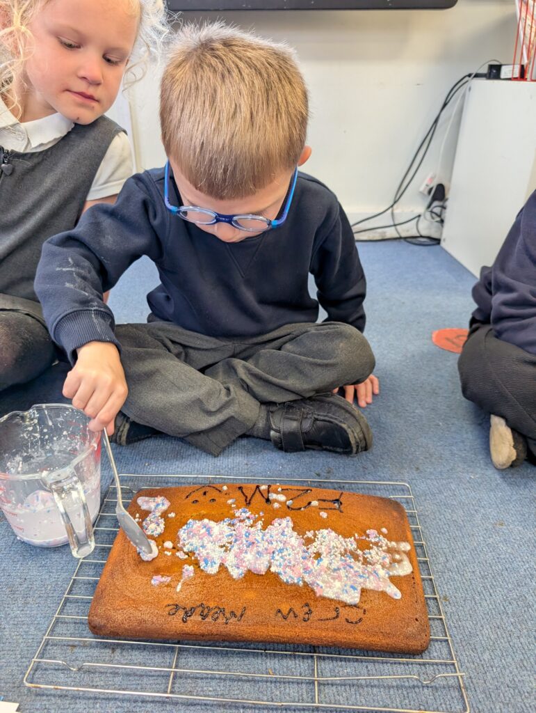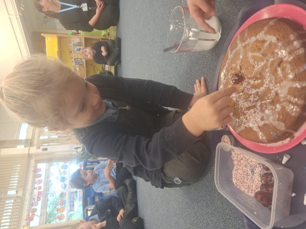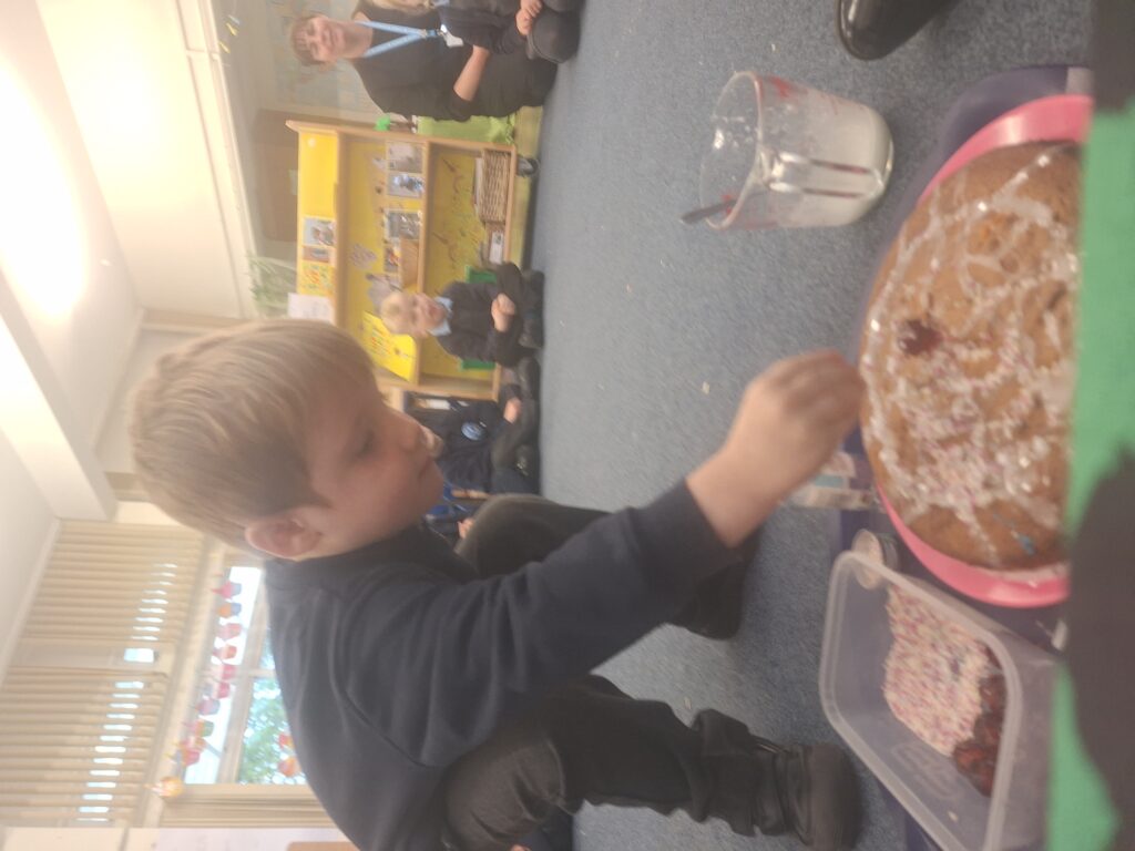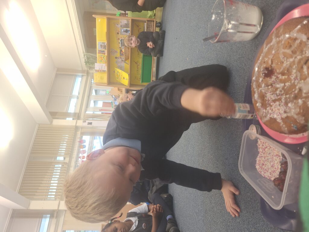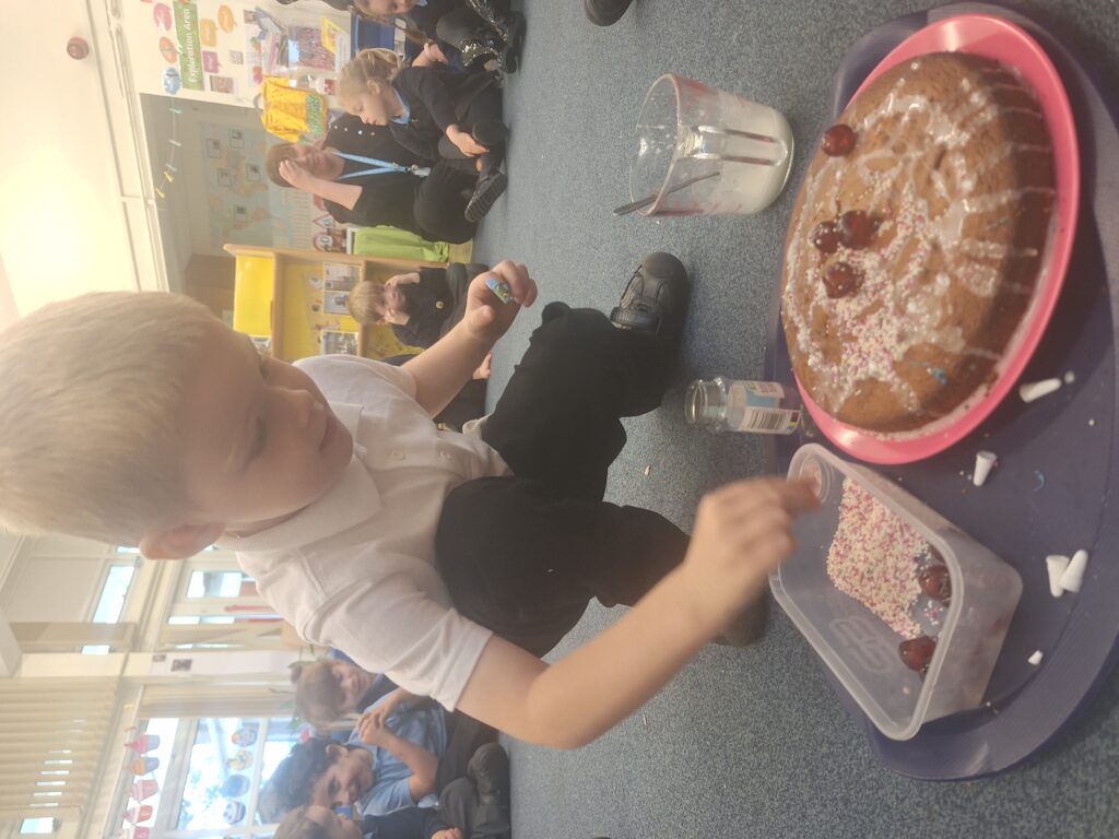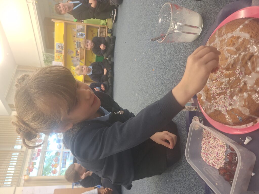Yesterday we baked a cake and today we decorated it. We all put icing, sprinkles or a cherry on top. Mrs Bubb used an icing pen to write ‘F2BP’. After that, we sat outside and all had a piece. Mrs Bubb forget to take photos of us eating it. She promises that she didn’t eat it all herself!