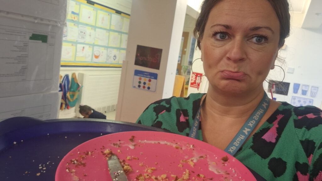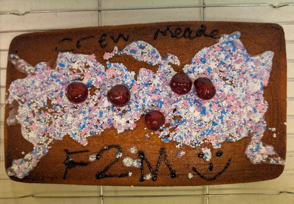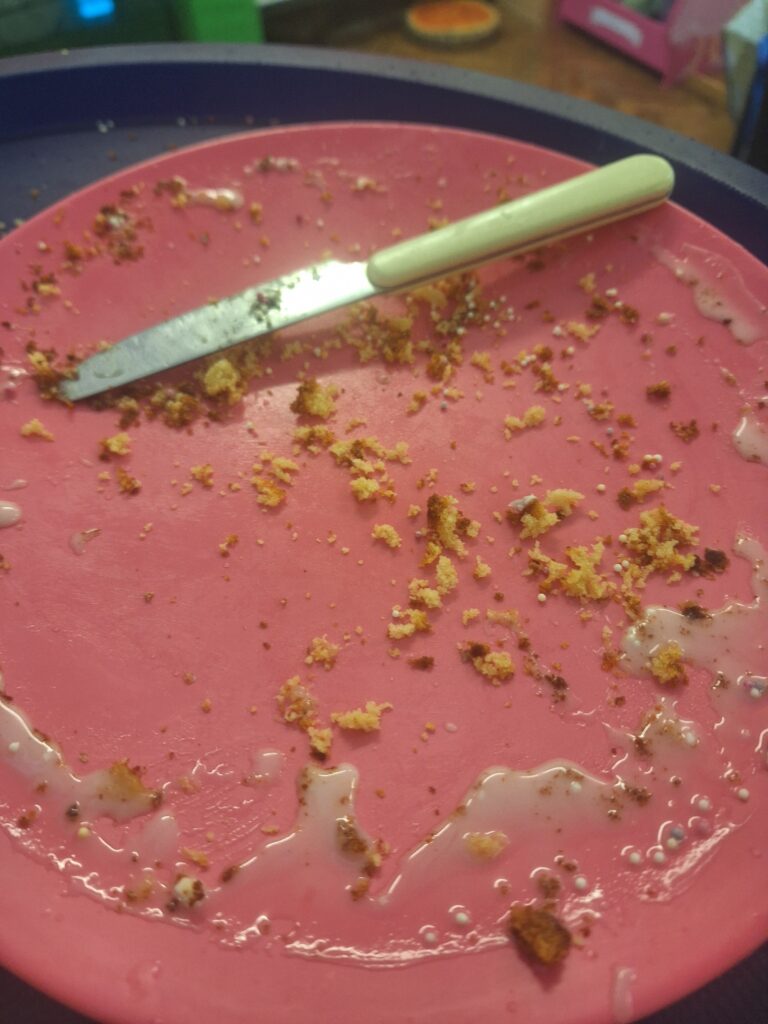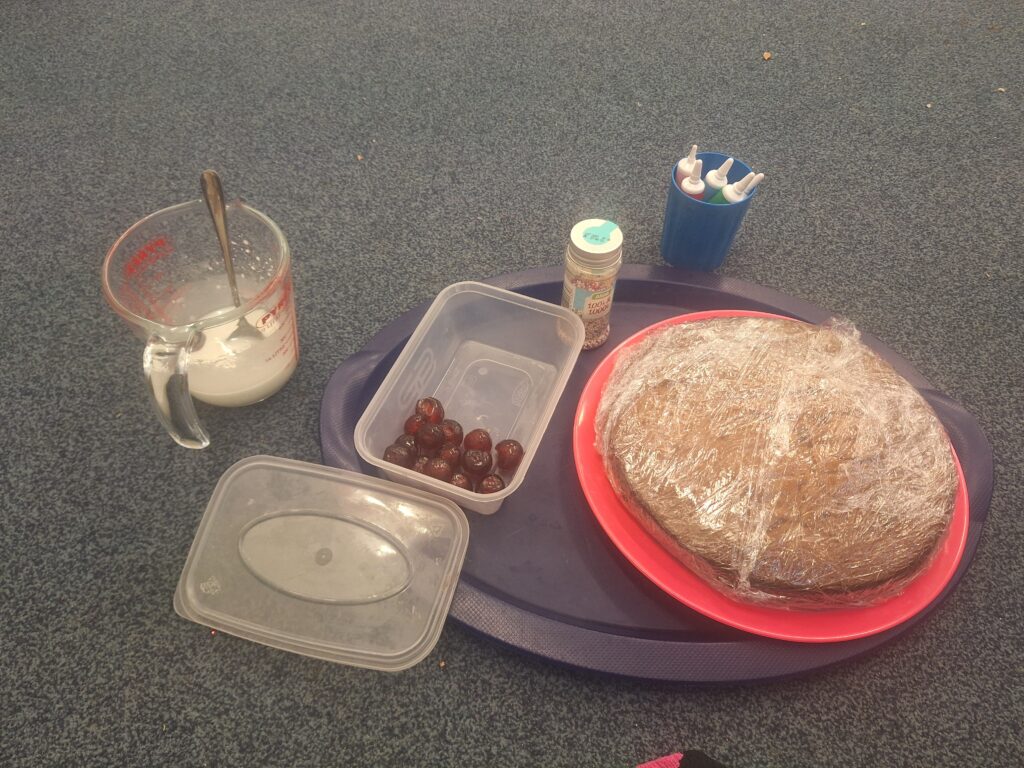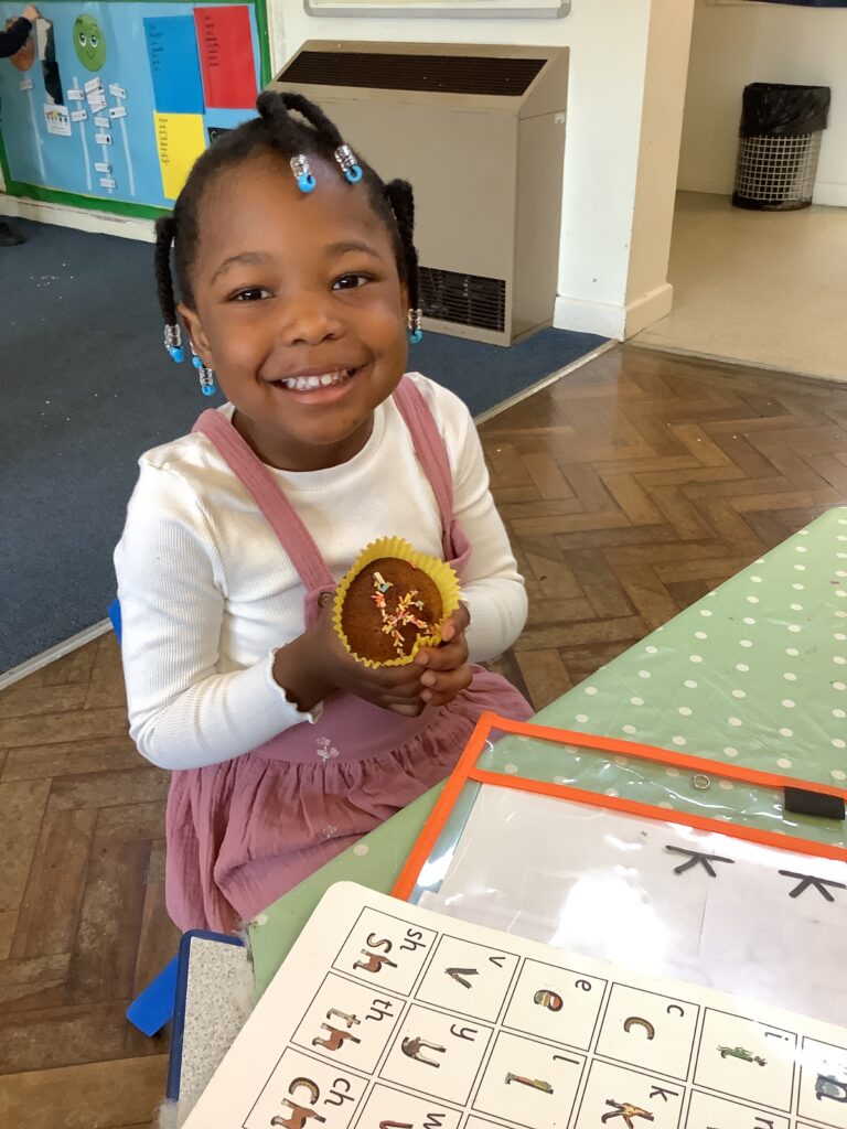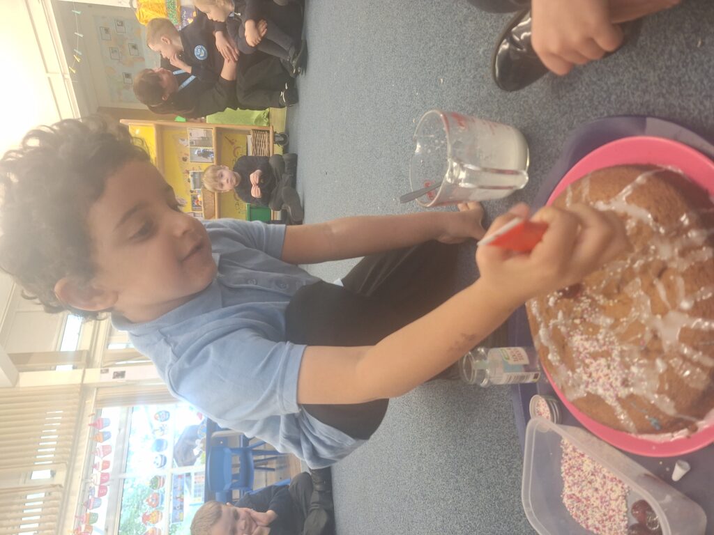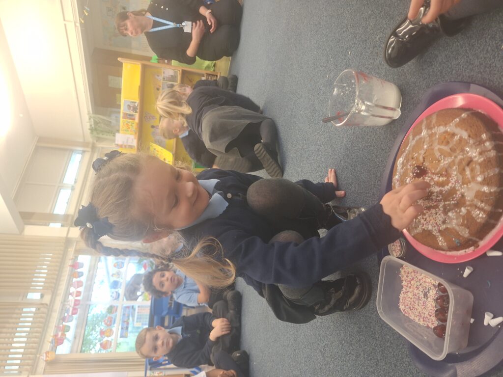 Yesterday we baked a cake and today we decorated it. We all put icing, sprinkles or a cherry on top. Mrs Bubb used an icing pen to write ‘F2BP’. After that, we sat outside and all had a piece. Mrs Bubb forget to take photos of us eating it. She promises that she didn’t eat it all herself!