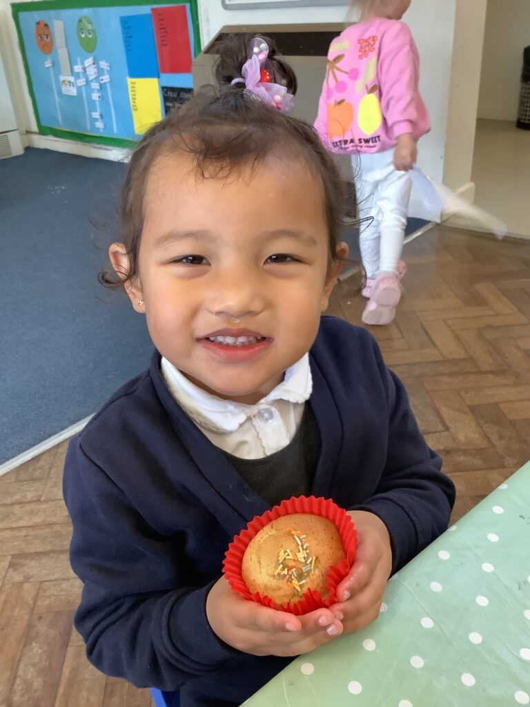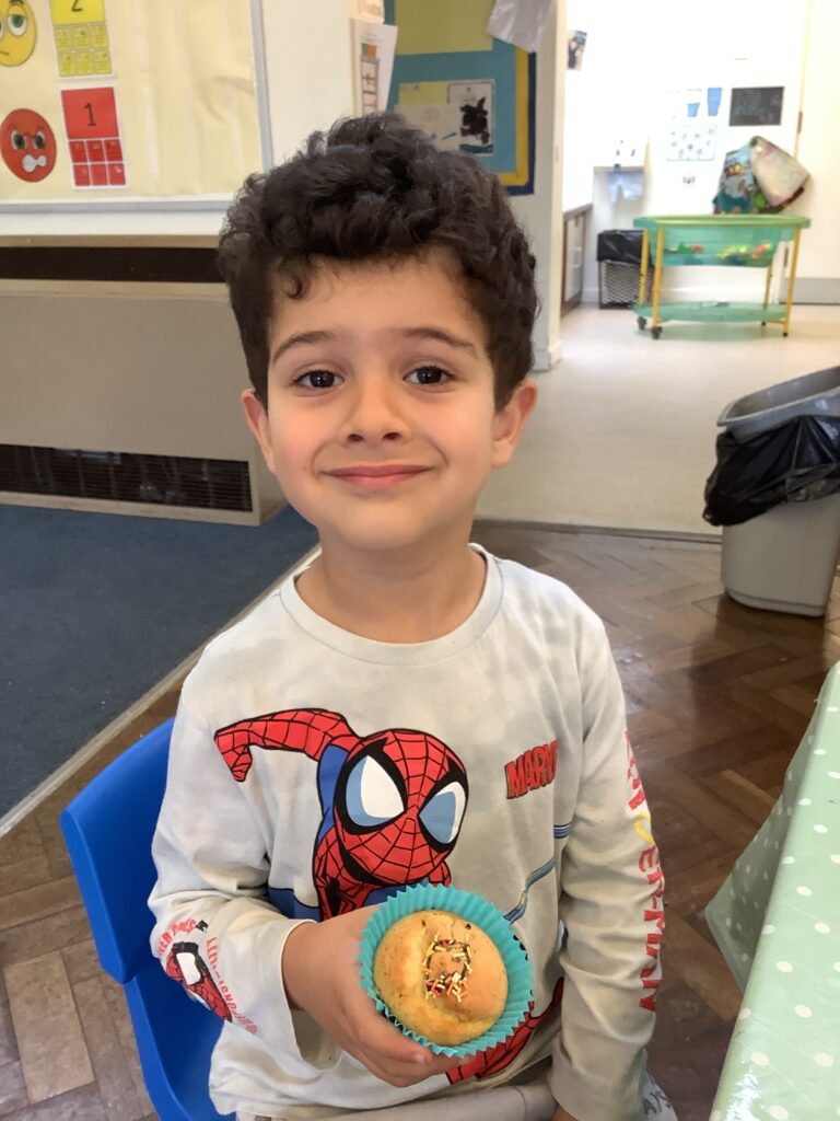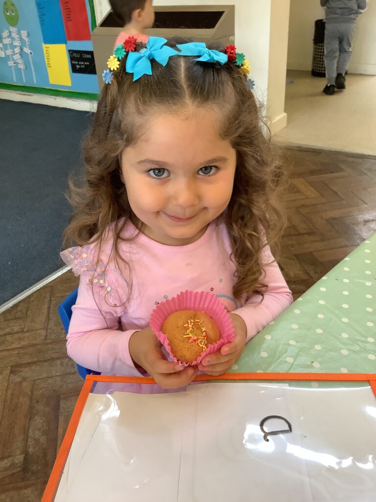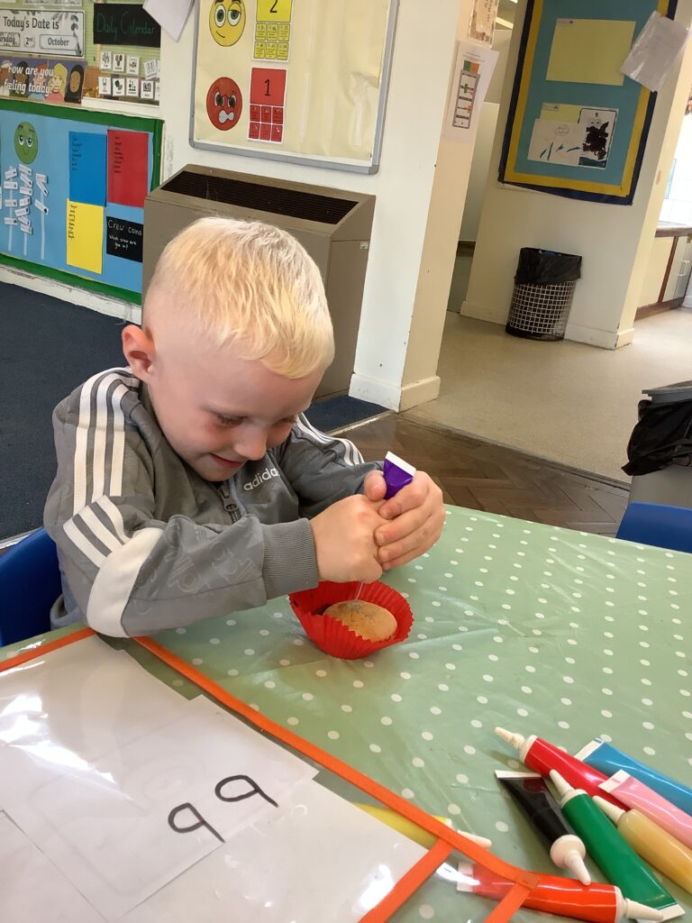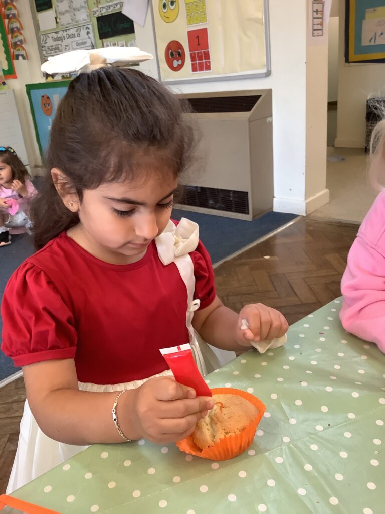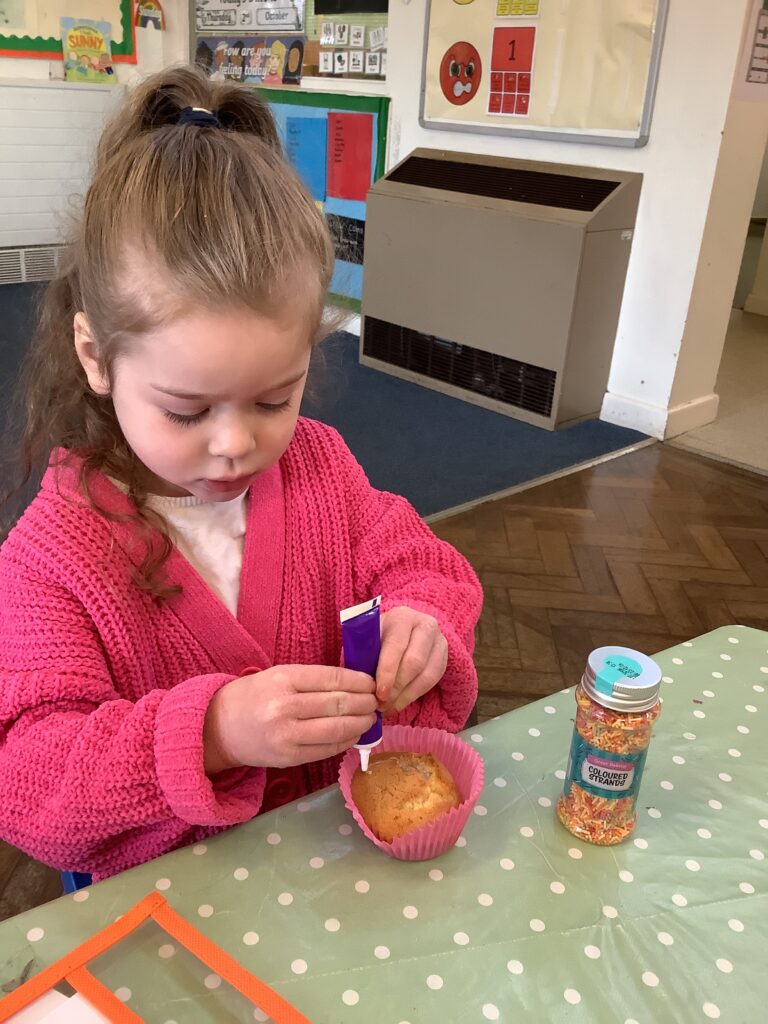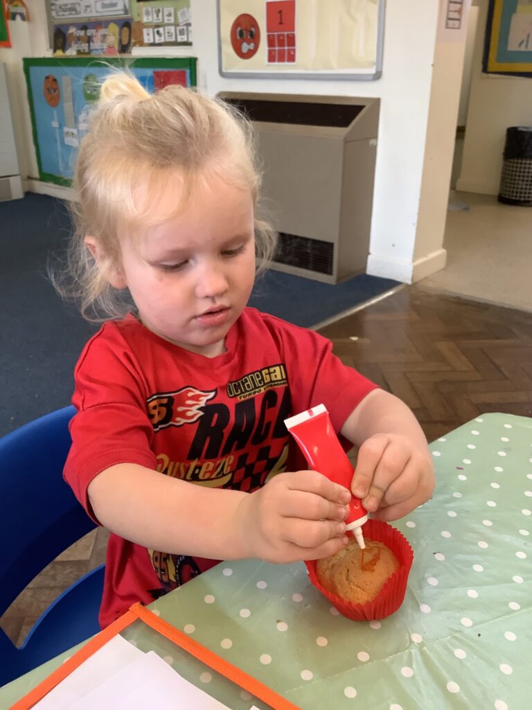Once they had cooled we decorated and ate our cupcakes. We used our fine motor skills to try and write the initial letter in our name, using the icing pens. They were delicious!