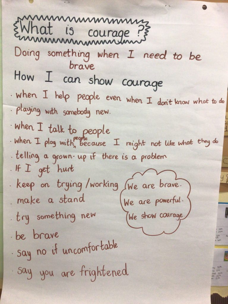 In crew today we have been learning about courage. We thought about when we have been brave. We learnt a song about being brave. We made an anchor chart of our ideas and we will be looking to see who shows courage each day.