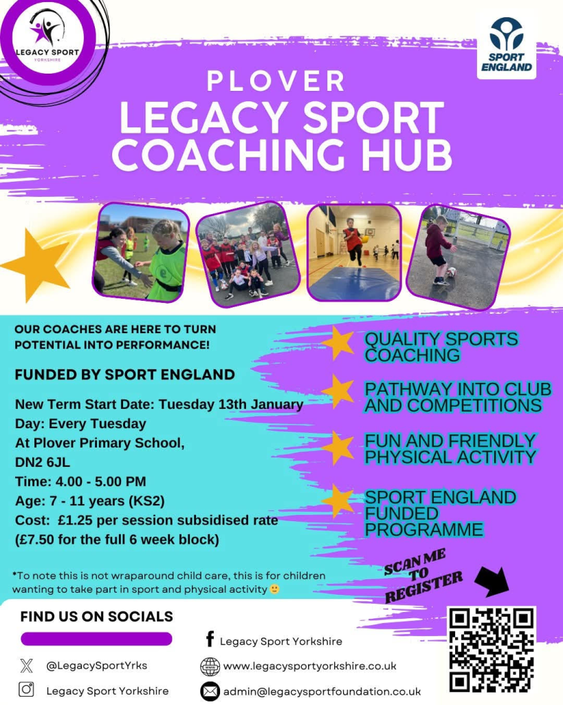 Scan the QR code to book on to a KS2 community sports club every Tuesday evening 4pm-5pm at Plover, £1.25 per session.