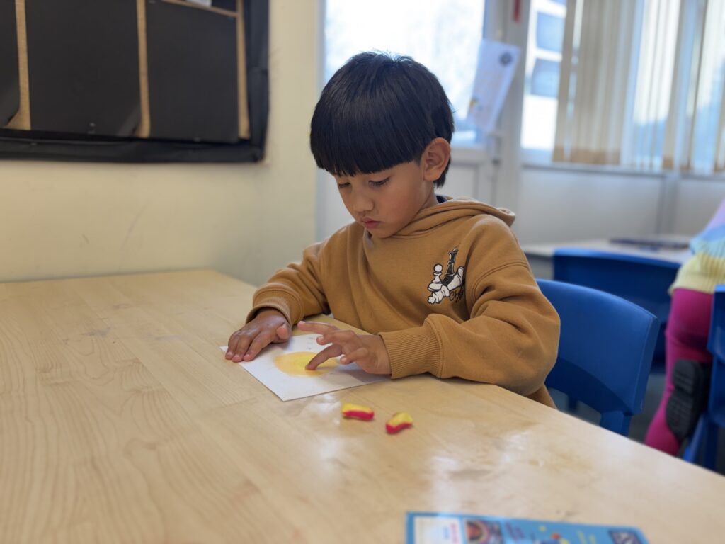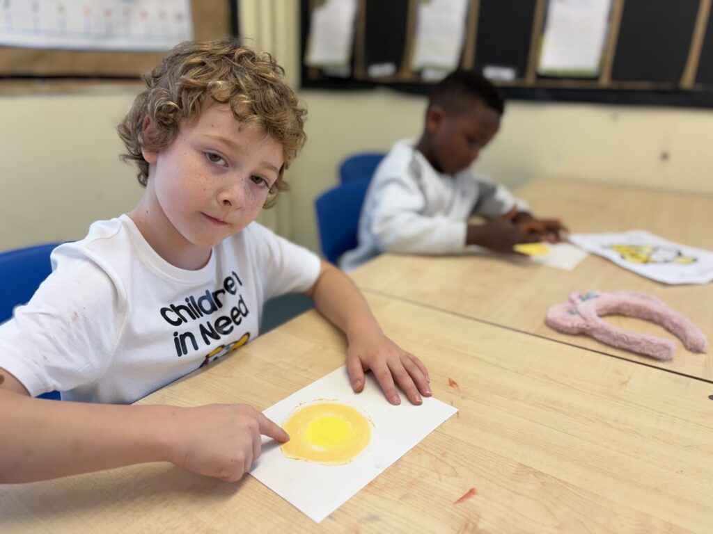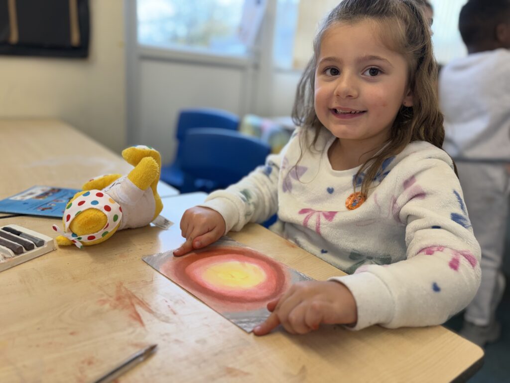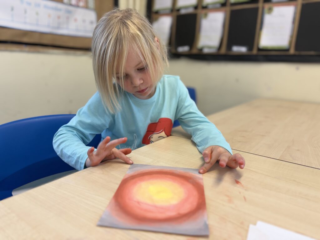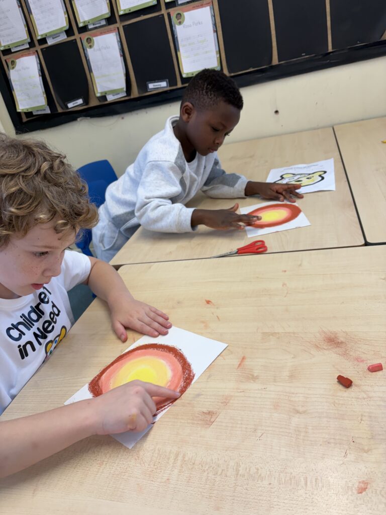 We are excited to share a little preview of the beautiful artwork we’ve been creating in class this week. The children have been experimenting with chalk to design a vibrant background, blending warm colours to represent the rising sun — a powerful symbol of hope pushing away the darkness of war.