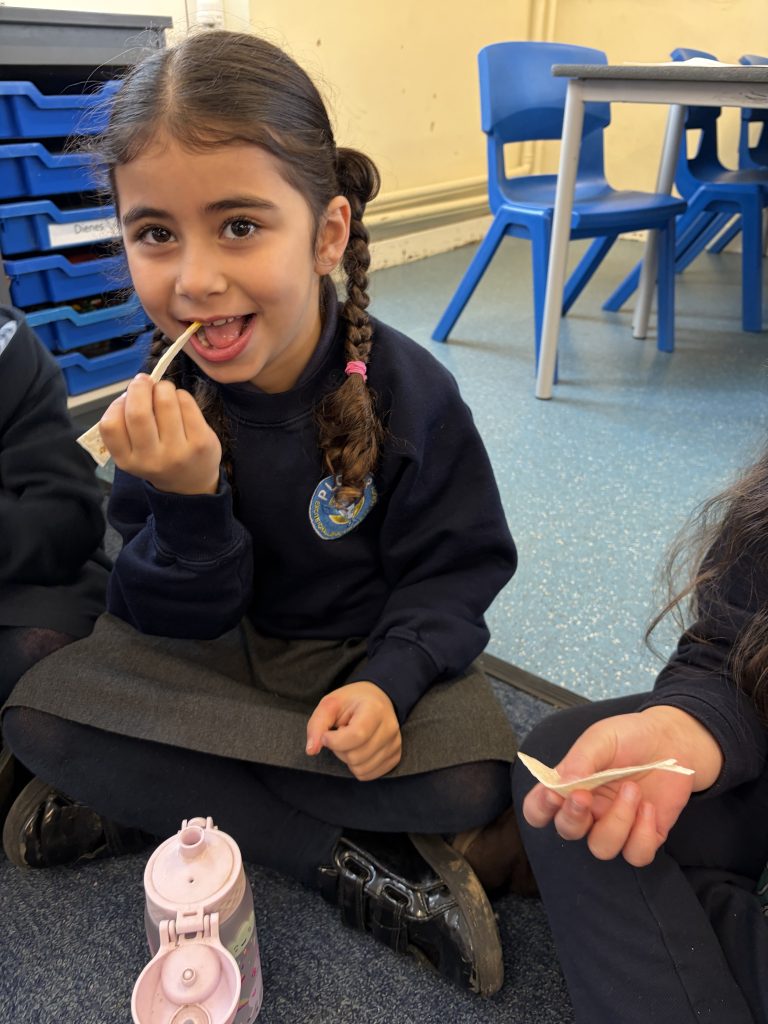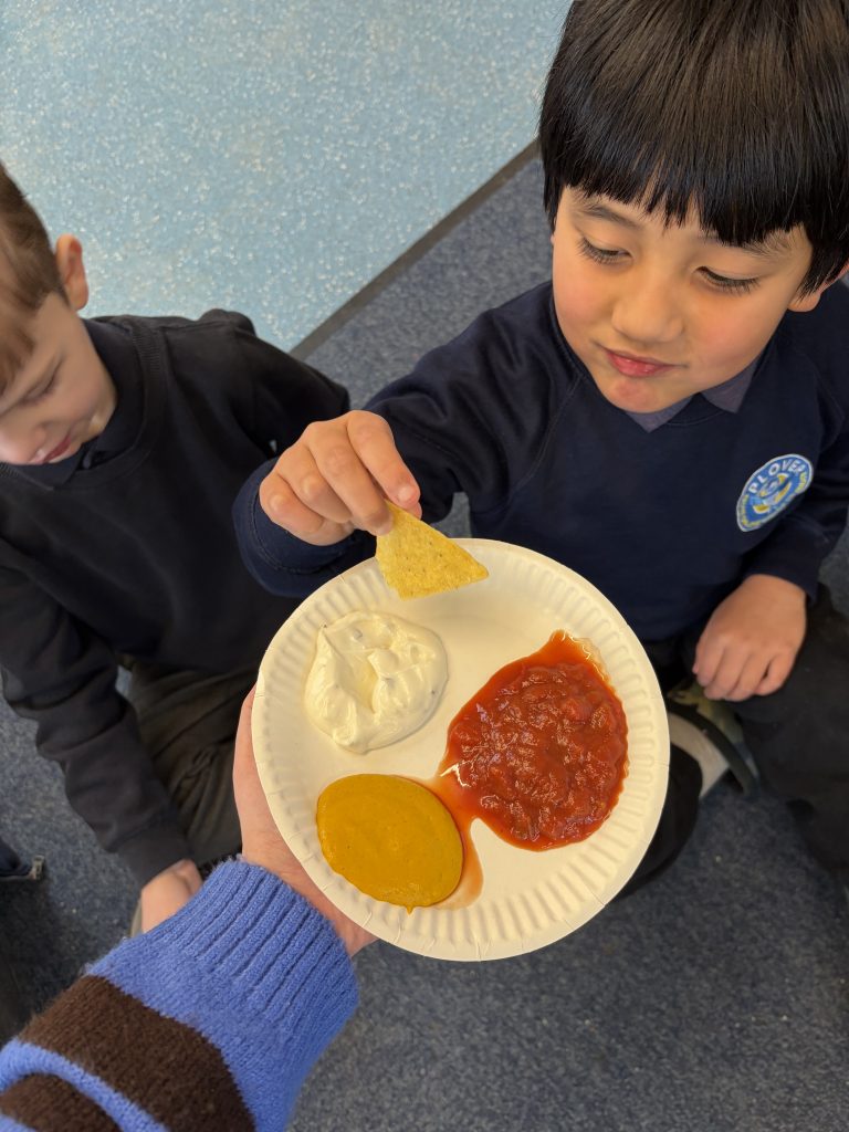 Round 3: Taste Test Challenge! It was time for a food-tasting adventure. The children sampled English favourites like Yorkshire puddings, liquorice, celery and mustard, before moving on to Mexican treats including lime, mango, tortilla chips with dip… and even chilli! Everyone was incredibly brave and tried something new. The tortilla chips and dip were the clear winners, giving Mexico the victory in this round.