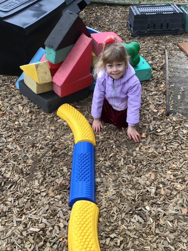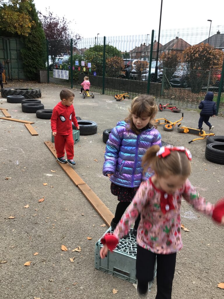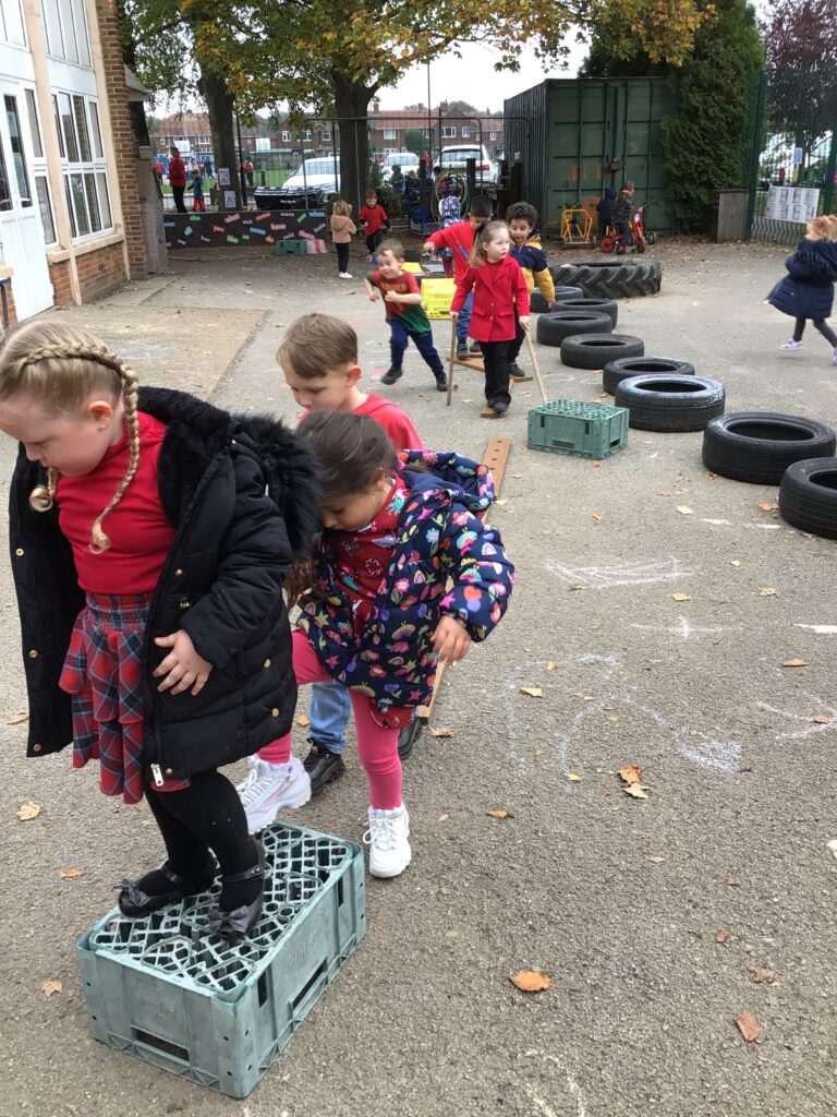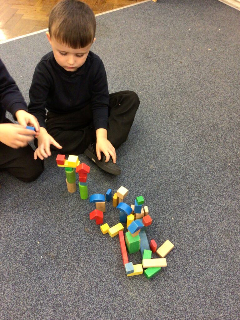 The children built a castle and then a road. They worked together and made it go round the other side of school. They used their gross motor skills to carry, balance and move in different ways.