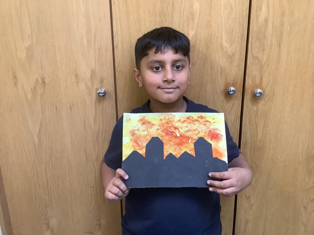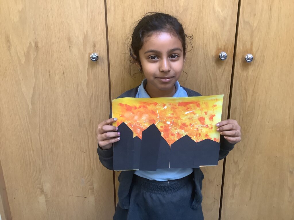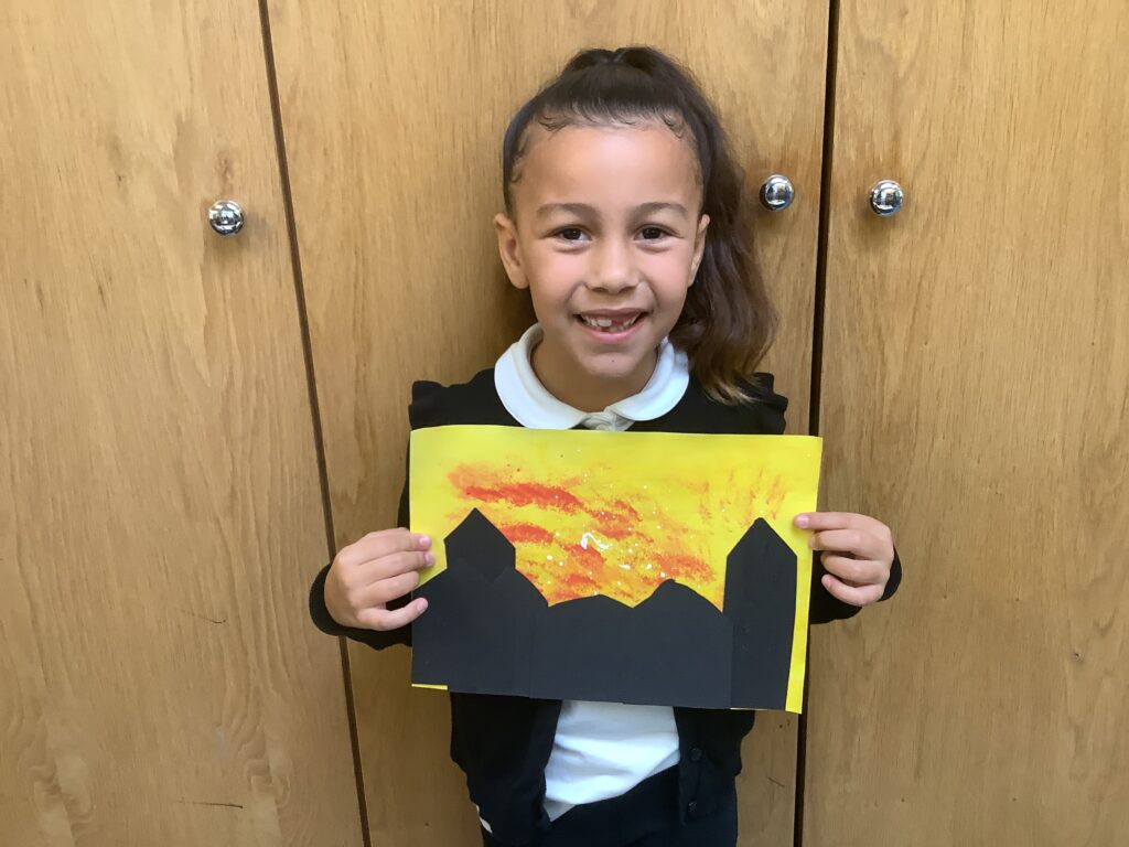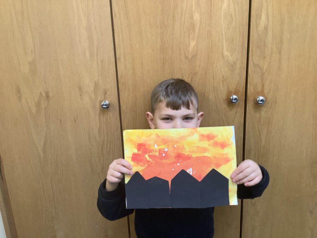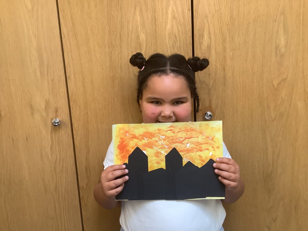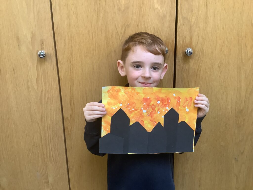 The children have been working to create a GFOL landscape piece of art. They used their knowledge of primary and secondary colours to create a fire effect background. They then created silhouette houses to create the houses from Pudding Lane.