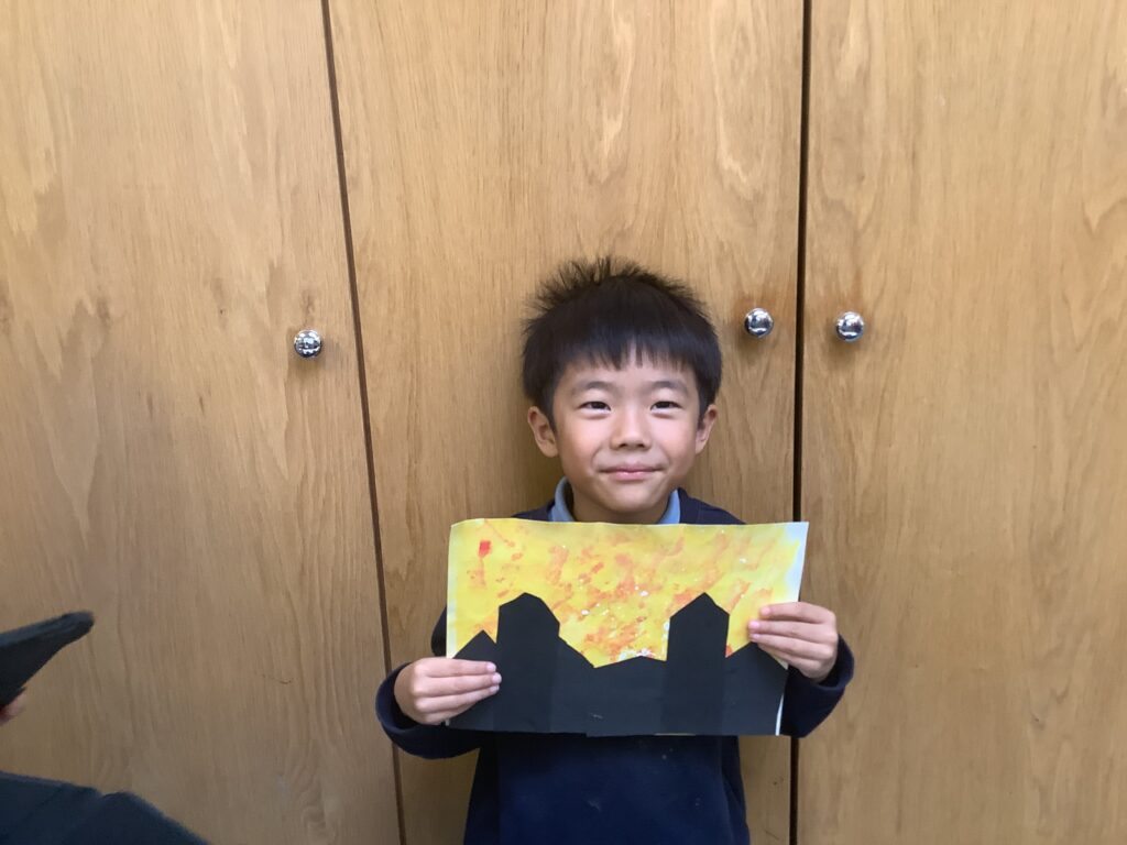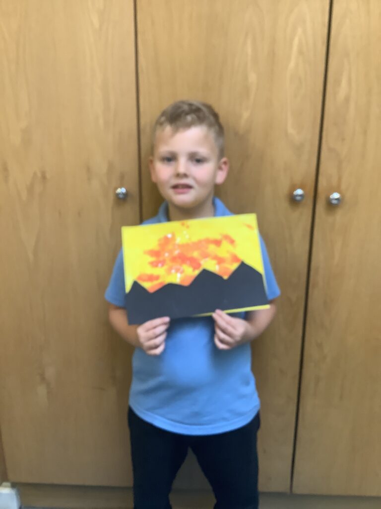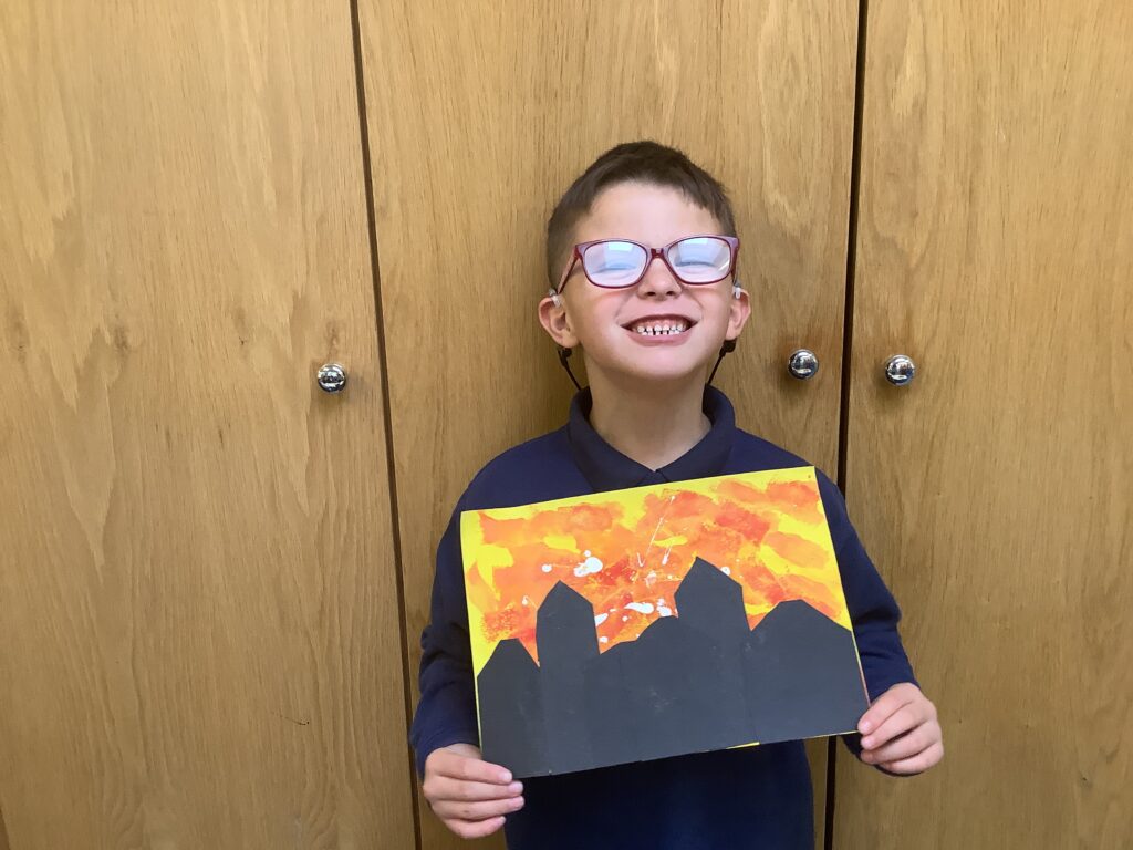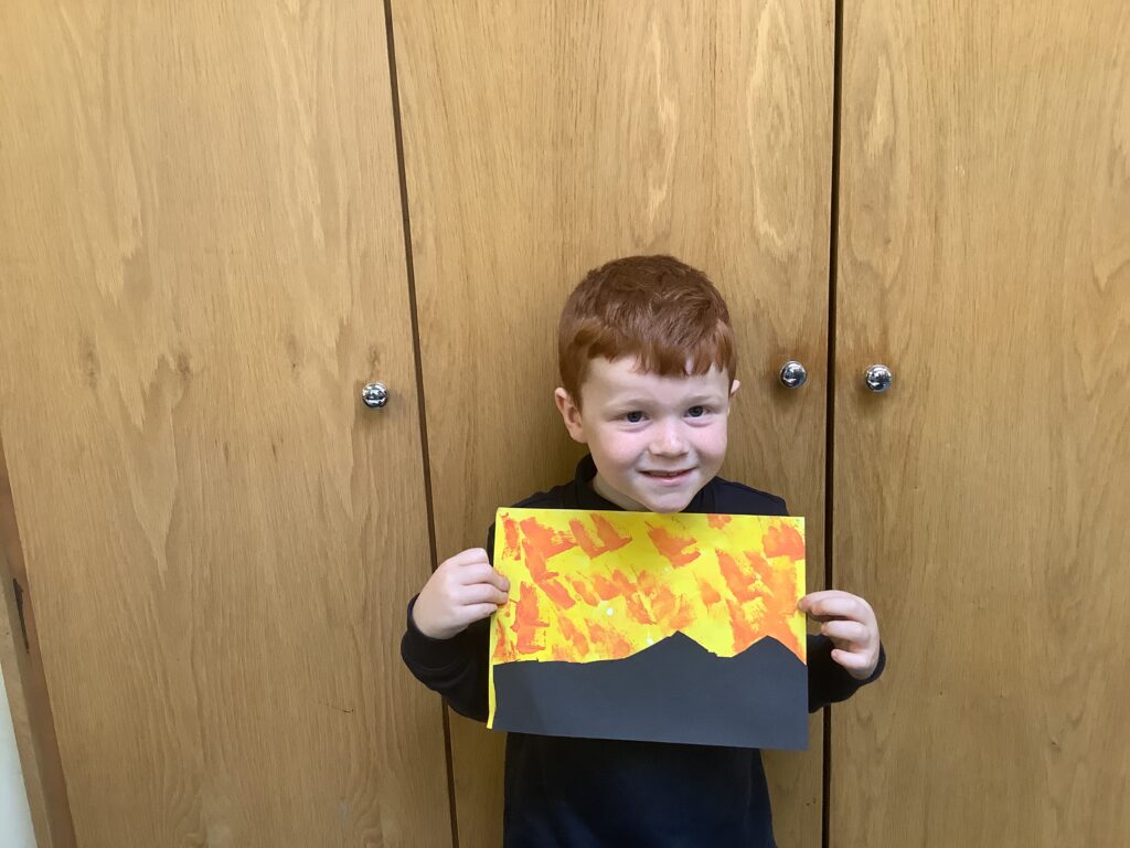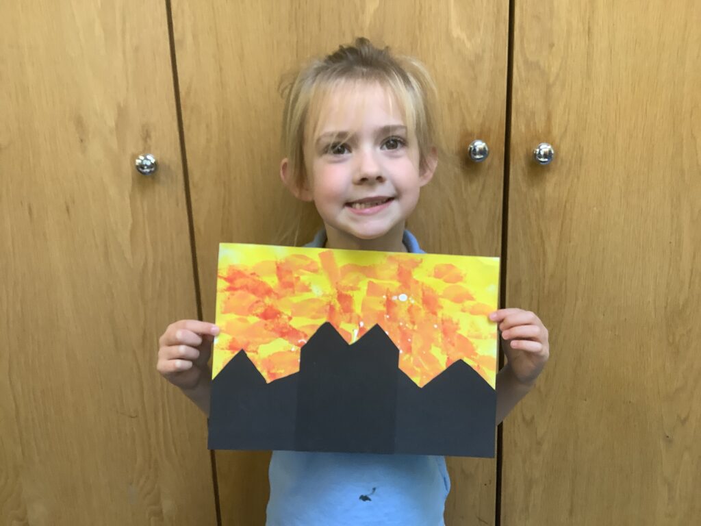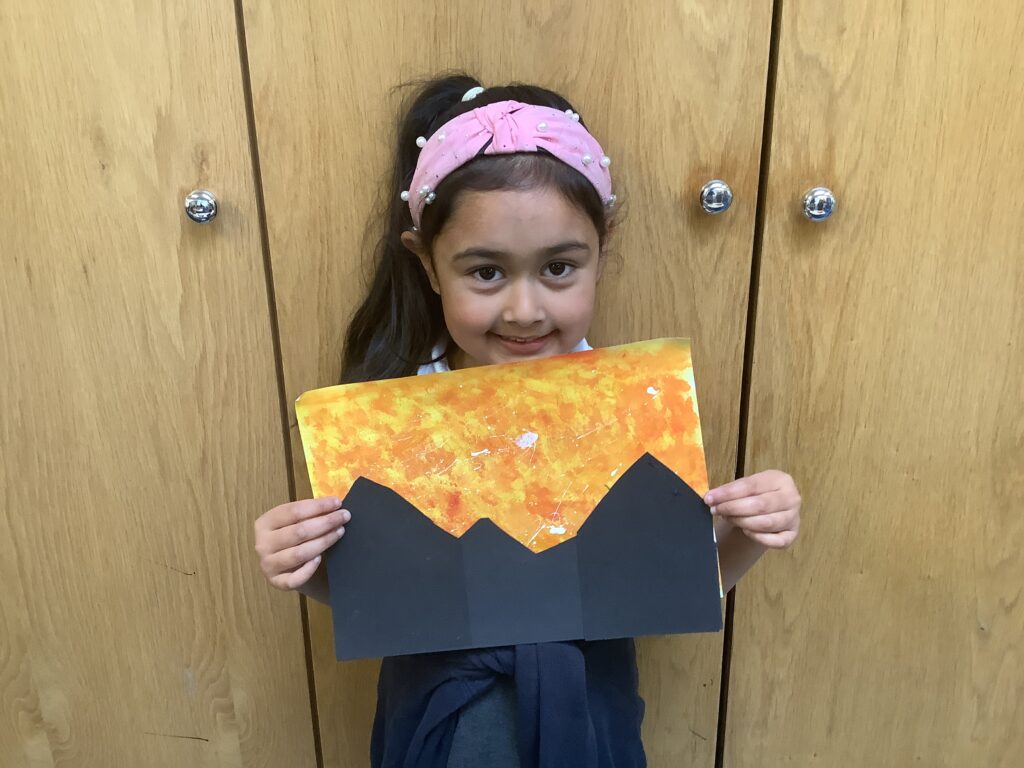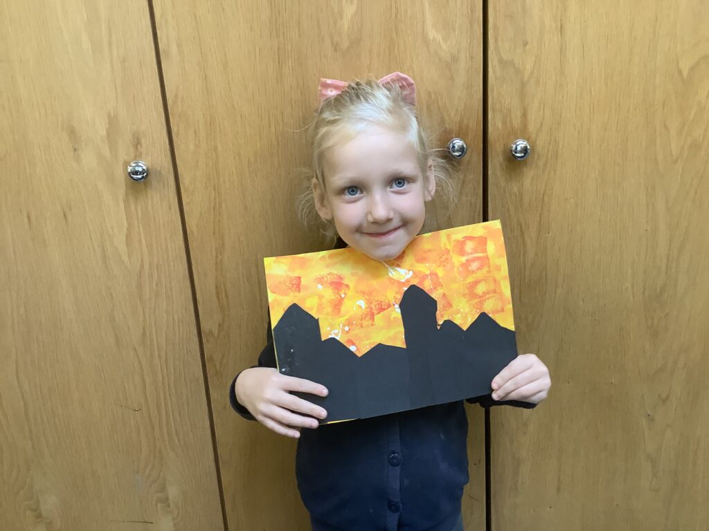 The children have been working to create a GFOL landscape piece of art. They used their knowledge of primary and secondary colours to create a fire effect background. They then created silhouette houses to create the houses from Pudding Lane.
