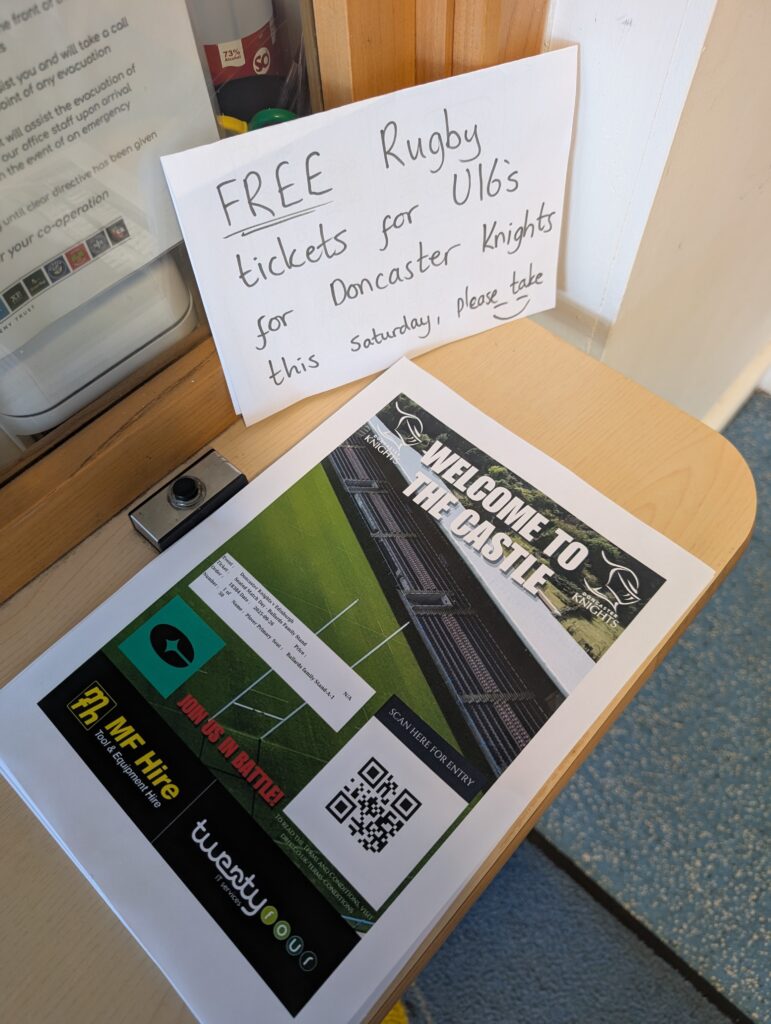 Please help yourself to some FREE Doncaster Knights Rugby Tickets in the main office.