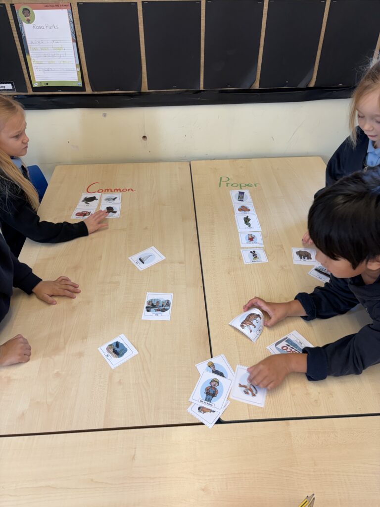 After learning together on the board, we split into teams to practise sorting nouns into common or proper. There was lots of discussion, teamwork, and excitement as we worked out which was which.