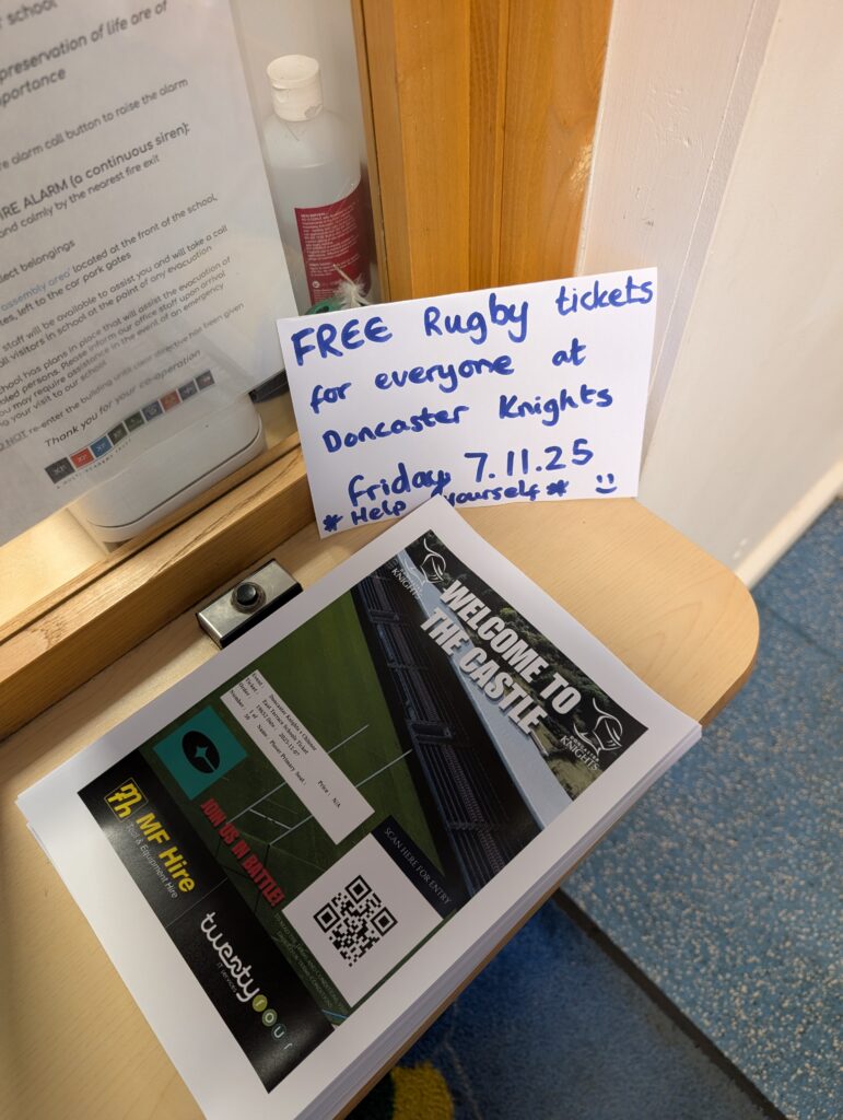 FREE Rugby Tickets in the Office 6th November 2025Joshua Meade We have 50 FREE Rugby tickets for adults and children, for the upcoming Doncaster Knights rugby match this Friday, 7.11.25. Please help yourselves to as many tickets as you wish. They are in the school’s main reception. #LovePlover