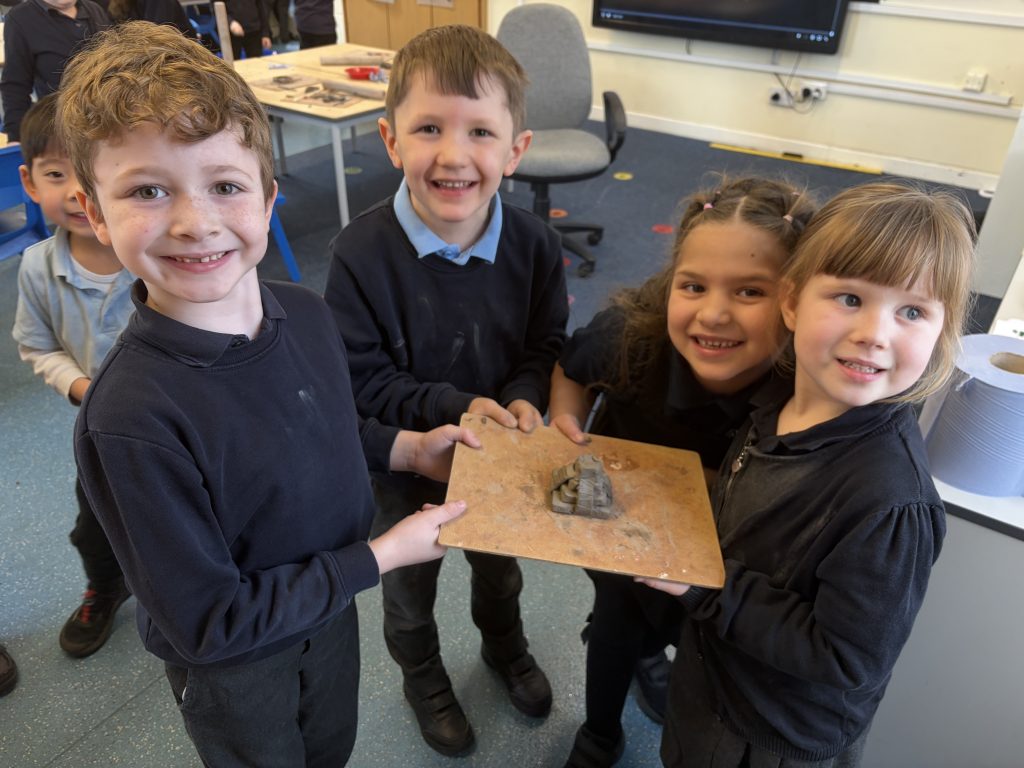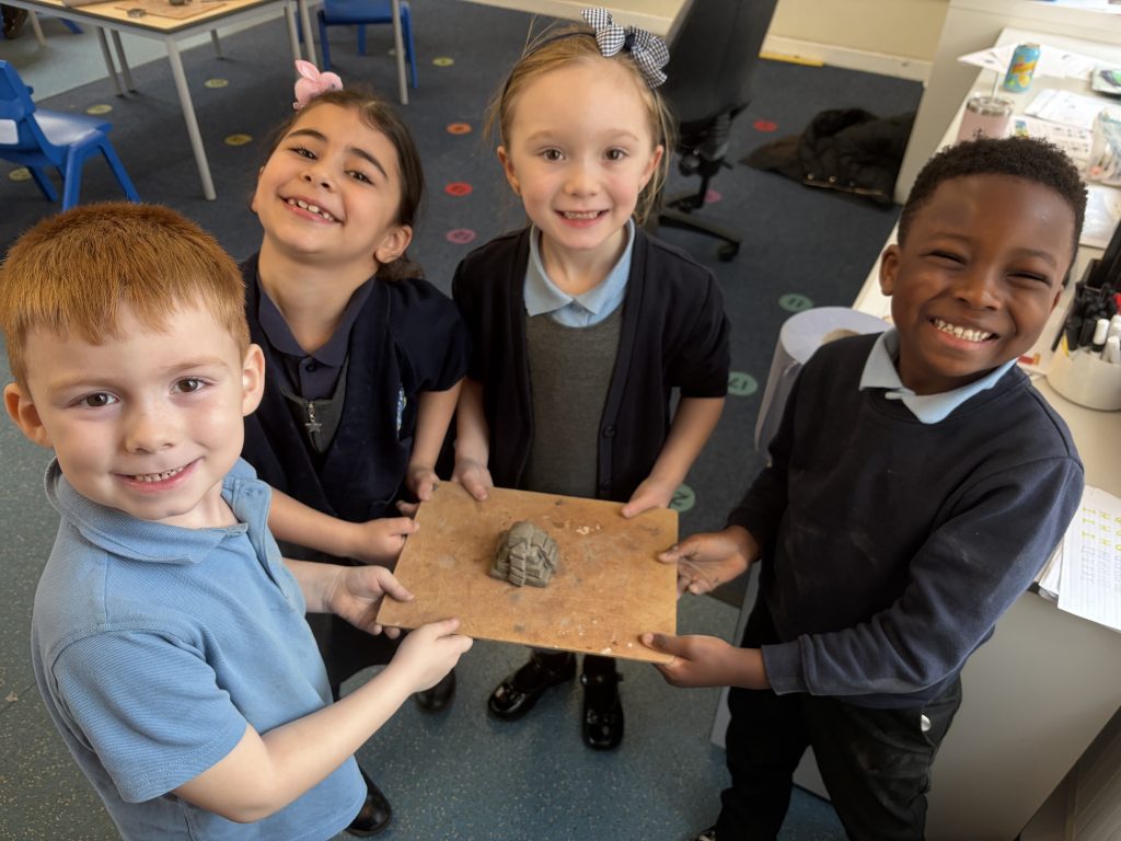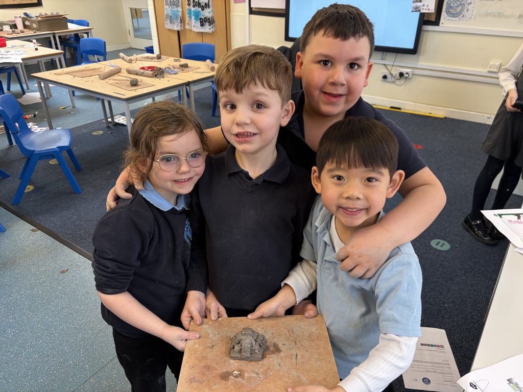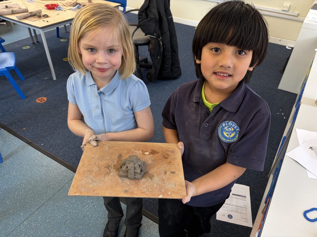 We then worked collaboratively to create our piece. The children had to roll out their clay to the correct thickness; to do this we used sticks to guide us! The children then used different cutters and used tools to help us cut off the excess clay. The children then scraped their piece and created a slip which helped to connect the pieces. They then rolled out an extra piece and used the tools to created the stairs.