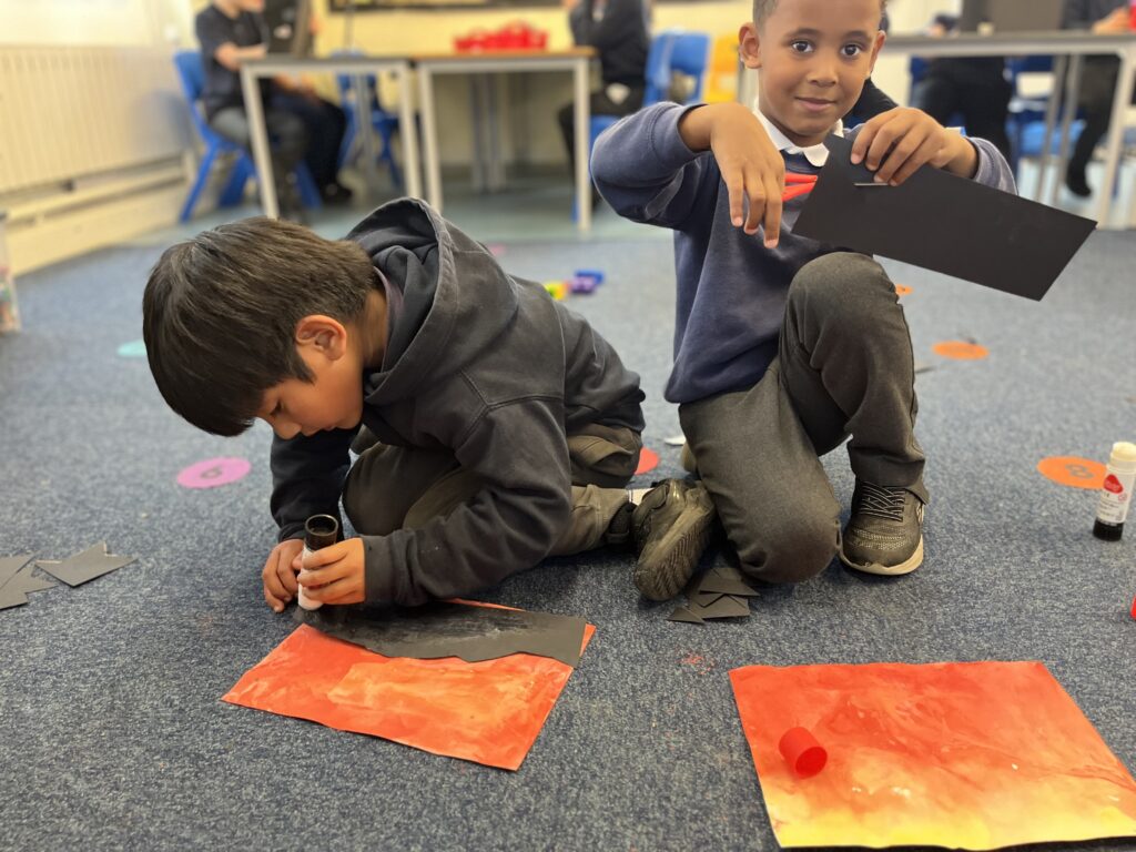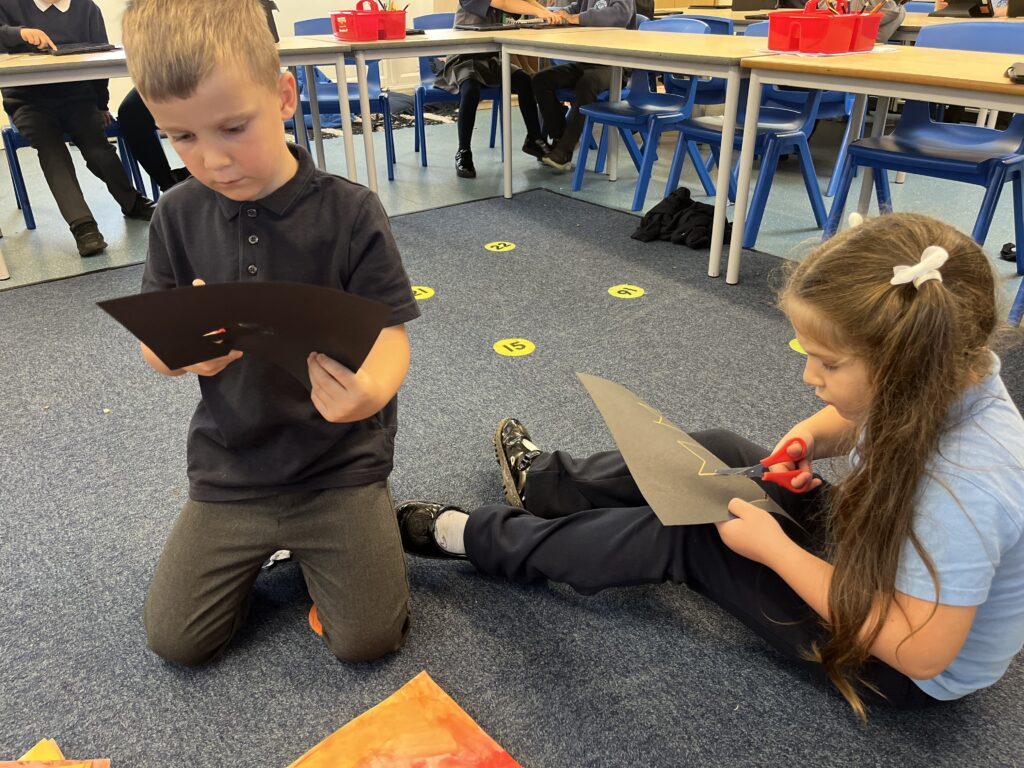 Today we have created a final piece of art to end our journey, learning about the Great Fire of London. The children talked about the warm colours representing the fire. We used a sponge to create an ombre effect for the background, making sure to dab to make it appear textured. The children then used their best cutting skills to cut out a design to represent the houses.
